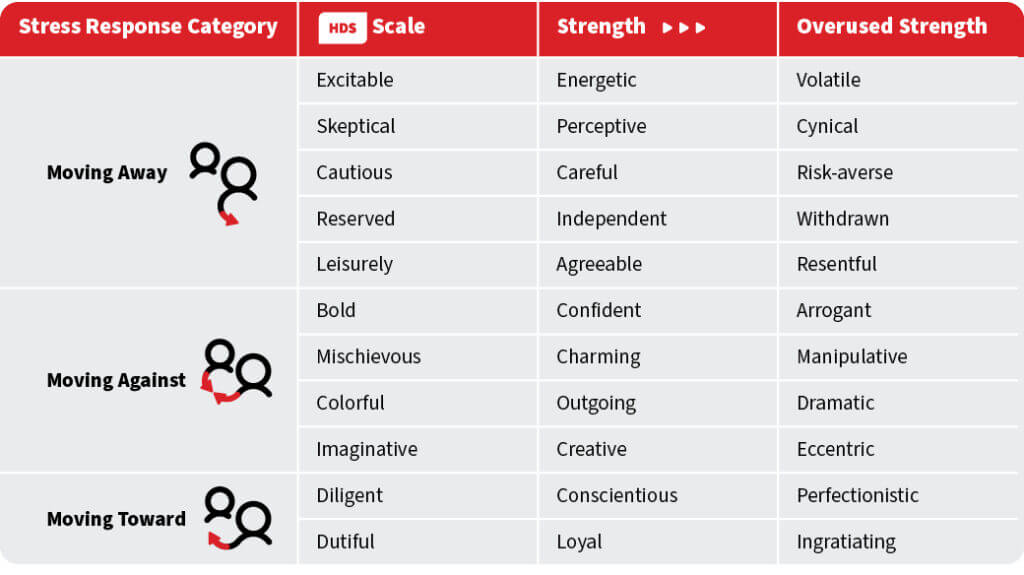 Dark-side Personality Characteristics แบ่งออกเป็นสามประเภทใหญ่ตามวิธีที่บุคคลมีแนวโน้มจะตอบสนองต่อผู้อื่นเมื่อหยุด self-monitoring ซึ่งเราเรียกว่า Moving Away from Others, Moving Against Others และ Moving Toward Others