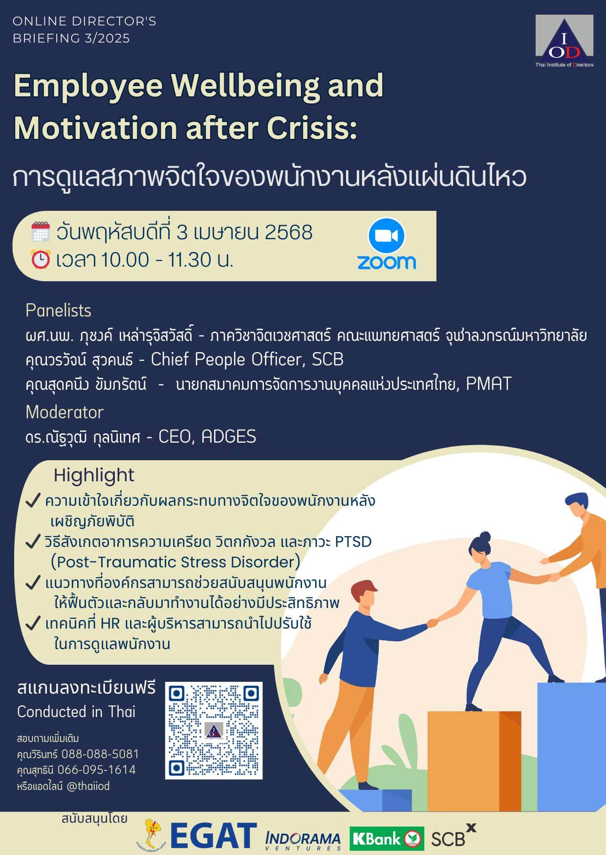ในหัวข้อ “Employee Wellbeing and Motivation after Crisis: การดูแลสภาพจิตใจของพนักงานหลังแผ่นดินไหว”