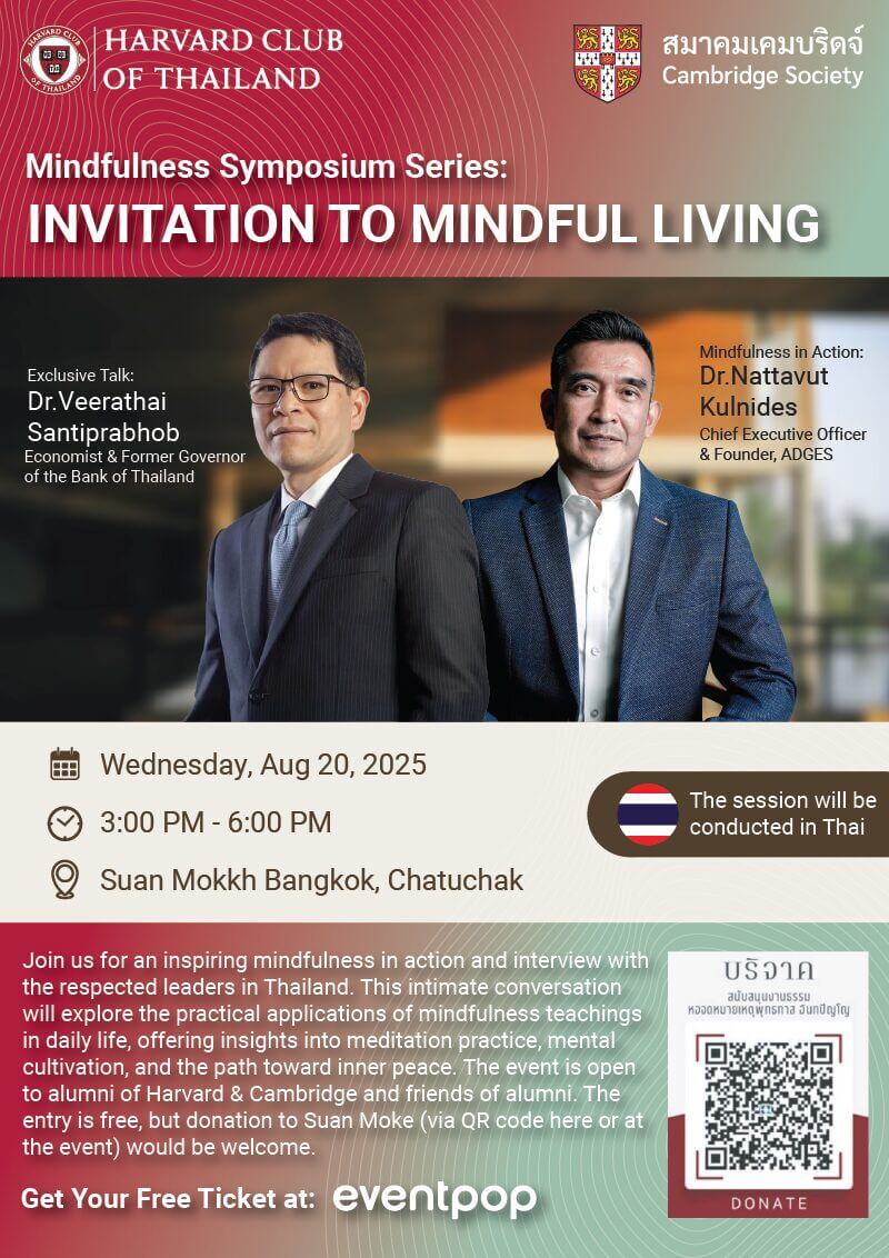 The Harvard Club of Thailand and The Cambridge Society warmly invite you to an intimate afternoon of reflection and insight with two of Thailand’s most respected leaders — Dr. Veerathai Santiprabhob and Dr. Nattavut Kulnides.