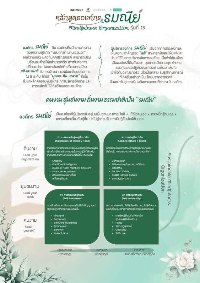 ซึ่งได้ร่วมกันพัฒนาหลักสูตร “องค์กร รมณีย์” ขึ้น เพื่อส่งเสริมให้ “สติ” หรือ Mindfulness กลายเป็นเครื่องมือสำคัญในการสร้างการตระหนักรู้ในตนเอง พัฒนาภาวะผู้นำ และผลักดันการเปลี่ยนแปลงทางวัฒนธรรมองค์กรอย่างยั่งยืน