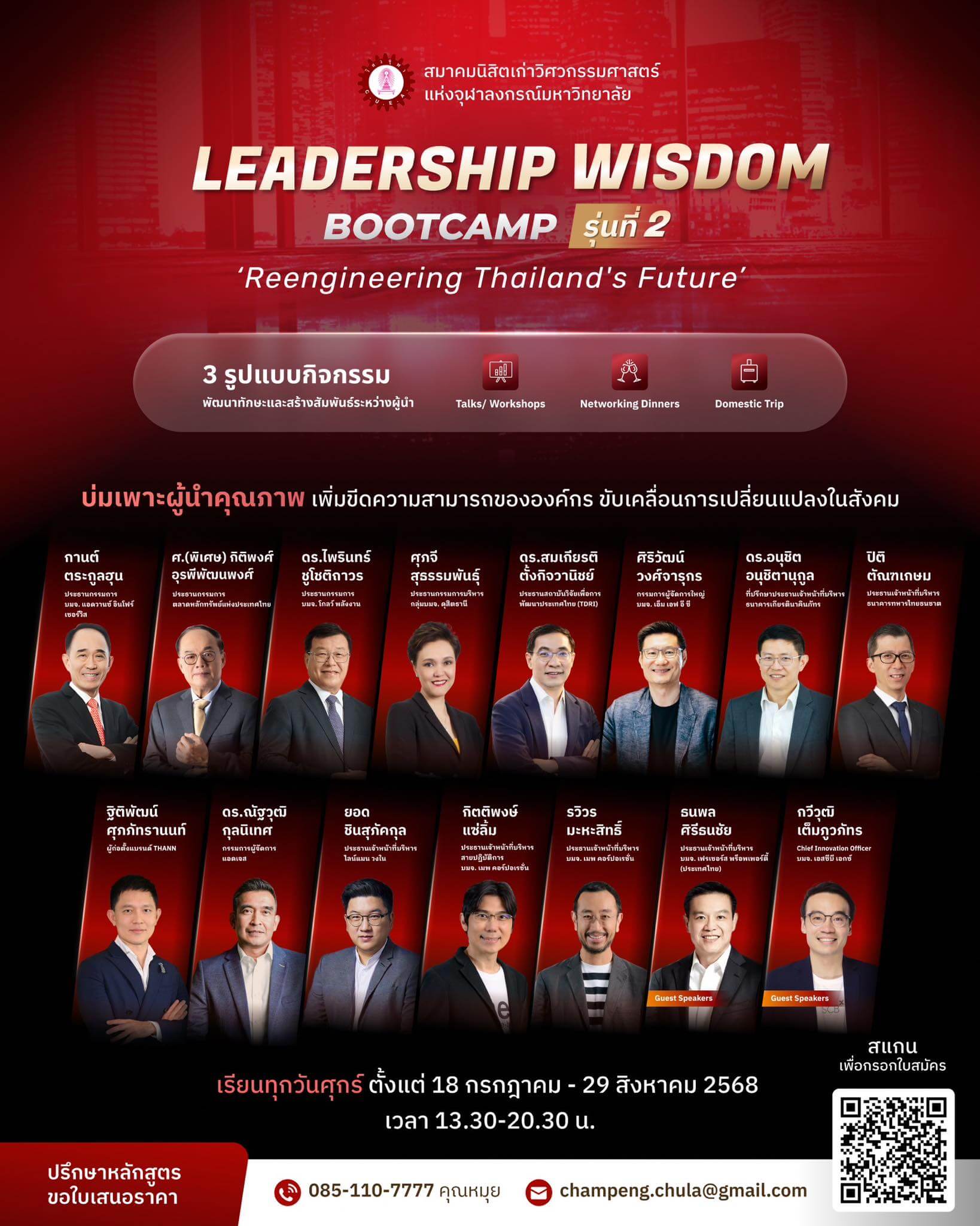 เป็นที่น่ายินดีที่สมาคมนิสิตเก่าวิศวกรรมศาสตร์แห่งจุฬาลงกรณ์มหาวิทยาลัย (สวจ.) เปิดรับสมัครหลักสูตร Leadership Wisdom Bootcamp รุ่นที่ 2 หลักสูตรพัฒนาผู้นำระยะเวลา 7 สัปดาห์ที่จะช่วยบ่มเพาะทักษะและวิสัยทัศน์สำหรับการขับเคลื่อนองค์กรและสังคม