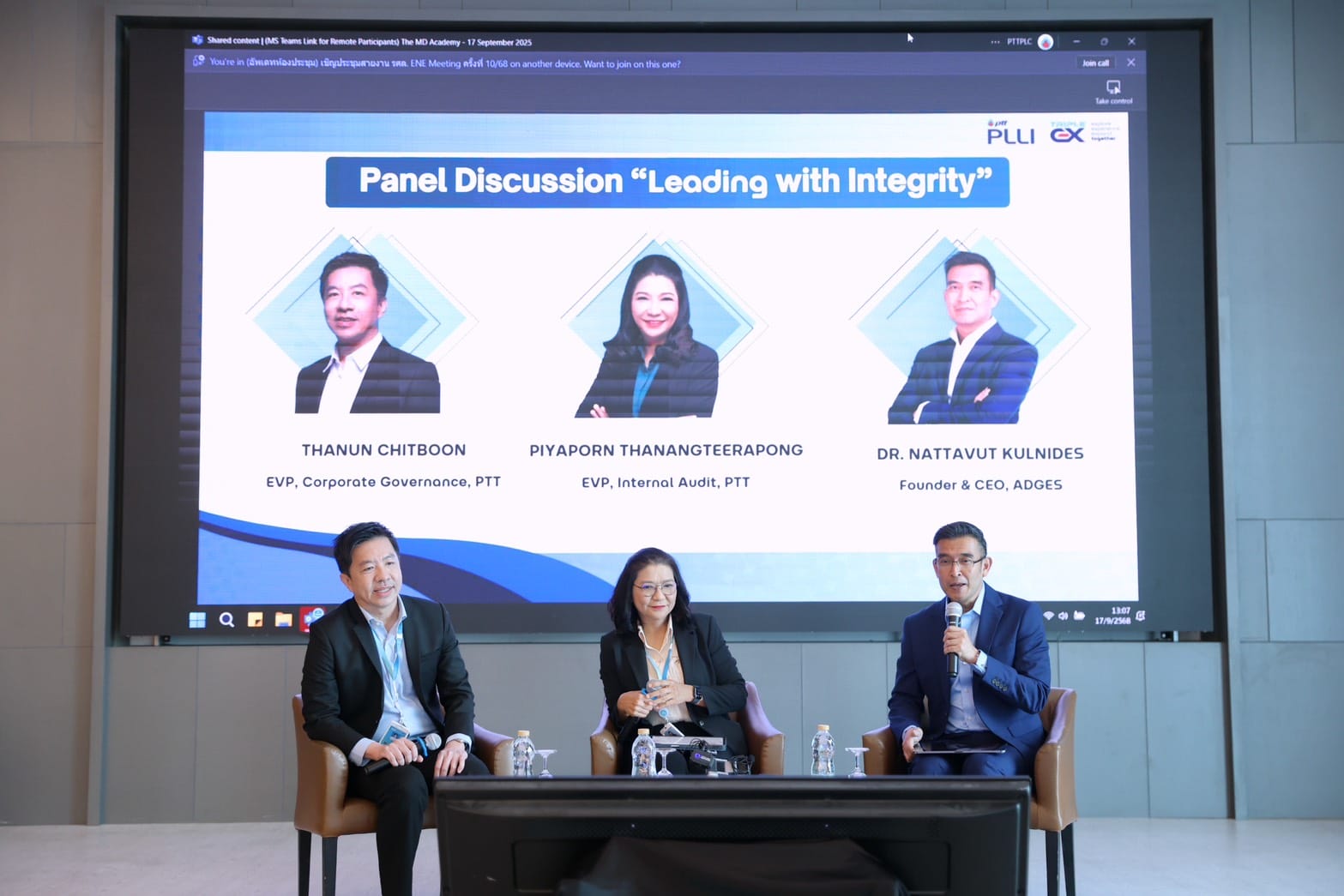 17 กันยายน 2568 – ดร.ณัฐวุฒิ กุลนิเทศ CEO & Founder ADGES ได้รับเกียรติจากสถาบันพัฒนาผู้นำและการเรียนรู้กลุ่ม ปตท. (PTT Leadership and Learning Institute – PLLI) เชิญเป็นผู้ดำเนินรายการ (Moderator) ในการเสวนา (Panel Discussion) หัวข้อ “Leading with Integrity” ร่วมกับผู้บริหารระดับสูงของ ปตท. ได้แก่